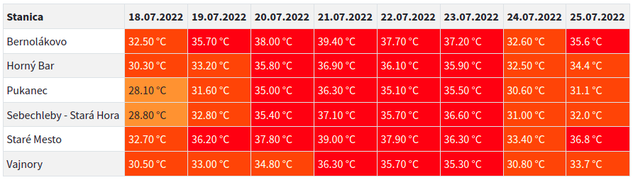 Vlna horúčav sa potvrdzuje aj v dosiahnutých teplotách za posledné dni. Na našich staniciach Bernolákovo, Horný Bar, Staré Mesto a Vajnory bol dnes už ôsmy deň v rade, kedy teploty cez deň neklesli pod 30°C. Na zvyšných dvoch v Pukanci a na Starej Hore šlo "len" o siedmy deň v rade.